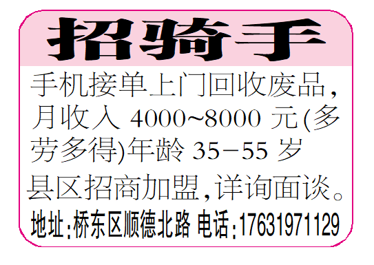 手机接单上门回收废品,月收入4000~8000元(多劳多得)年龄35-55岁★县区招商加盟,详询面谈。地址:桥东区顺德北路。